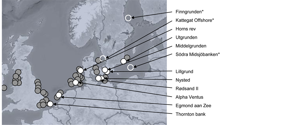 Figure 1. Operating wind farms (2015) in northern Europe. Circles indicate wind farms >10 MW at water depth >2 m where filled white circles are wind farms referred to in this review. *Open circles indicate planned wind farms referred to in this review. Data from 4C Offshore Database.