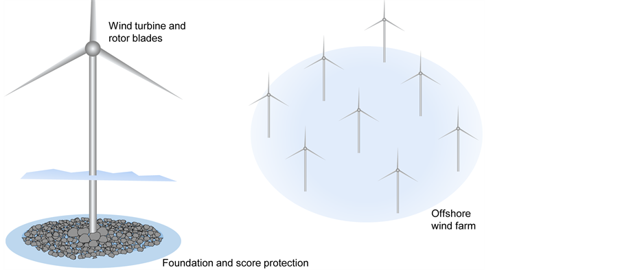 Wind farms have different effects on different taxa and the potential for conservation benefits are therefore dependent on the specific target for conservation. In this section we review wind farm induced changes to 1) seabed habitats and benthos, 2) epifouling benthos, 3) fish, 4) marine mammals, and 5) seabirds. A brief illustration of offshore wind power is given in Figure 2.