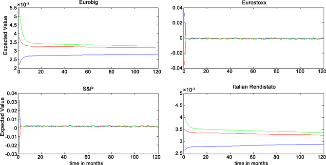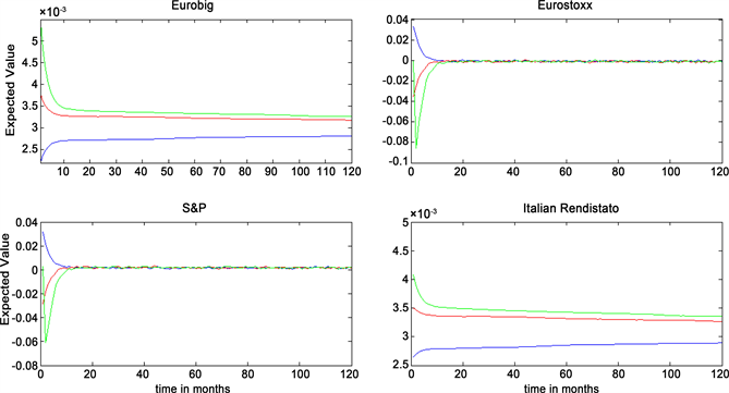 Figure 3. Modified four-dimensional VAR (1) model. Expected values with different initial values. Number of simulations = 10,000.