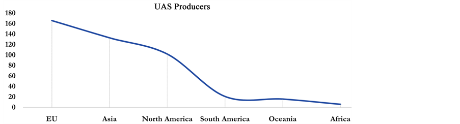 A world’s UAS production map clearly shows an unbalance in profitability across continents. In 2009, North America alone generated profits of $2.7 billion followed by Europe with $780 million while the rest of the world barely made $280 million [2] . Additionally, Chamata (2016a) argues there is an unbalance in the number of manufacturers worldwide. He shows industrial evidence that the number of manufacturers is overruled by the EU, Asia-Pacific and North America (Figure 1); while South America (i.e. 21 producers) and Africa (i.e. 6 producers) are way lagging behind [16] .