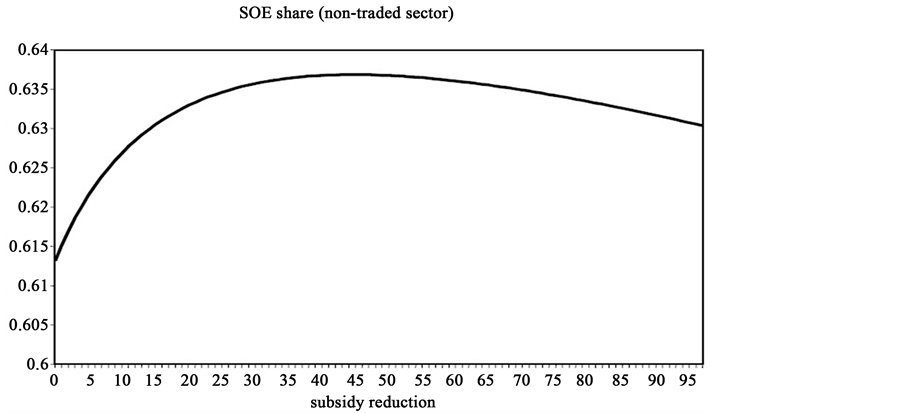 Based on Bajona and Chu’s dynamic general equilibrium model, removals of minimum employment restriction and subsidies to capital would have significant influence on GDP, welfare and SOE output shares. Assuming a closed economy with fixed tariff to isolate the effects of SOE reforms, this model tested the data from 1978 to 2001 to infer a foresight of the tendency under WTO regulations. As a result, there tended to be strong negative correlation between the reduction of the minimum employment level and the SOE market shares. That is, as the labor restriction being released gradually, the SOE decreased in its contribution to the total output. In terms of the subsidies’ effect, a reduction in subsidy would weaken the role of the SOE in traded sector while a small reduction tended to boost SOE shares in non-traded sector at first until the reduction became sufficiently large. The effect is represented in Figure 1.