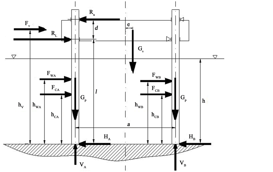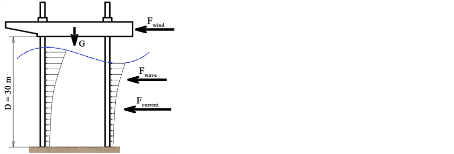 The loads acting on the jack up structure (Figure 4) are: platform weight (G), wind pressure (Fwind), wave action (Fwave) and current pressure (Fcurrent).