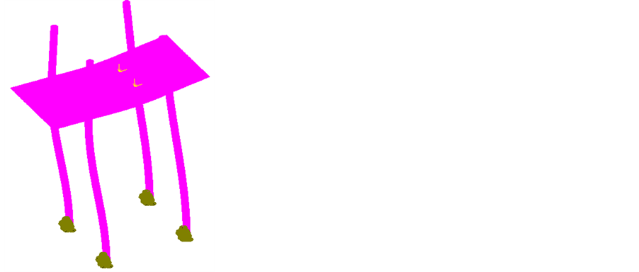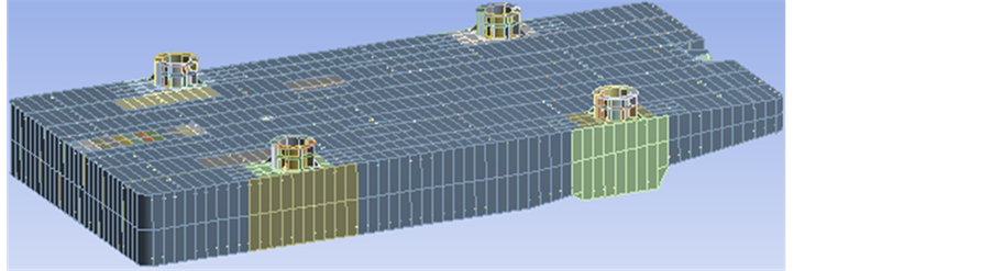 The rigidity of the platform structure is bigger than the rigidity of the legs structure. Therefore, for FEM analysis of the behaviour of the jack up unit (platform on legs), the platform structure was considered as a very rigid body connected with the legs having the real rigidity.