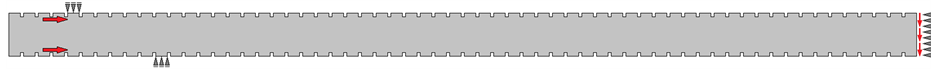 The final configuration of the FEM model is concerning: the leg length of 35 m supported by the both guides (the upper guide at 32.5 m and the lower guide at 29.5 m from the lower end of the leg). At the lower section of the leg the transversal force of 155.5 kN and longitudinal force of 2000 kN are acting. These loads occur from the reactive forces provided by the soil. In the upper end of the leg the longitudinal displacement is blocked.