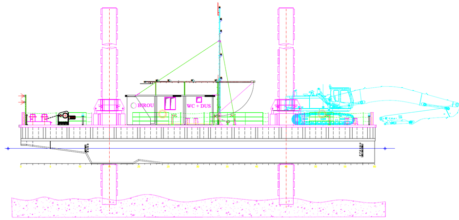 Such unit, shown in Figure 1, used for Black Sea near shore all-year operations, such as quay constructions, is analyzed in the paper. In spite of diminished environmental conditions, the unit is designed so that to fulfill all requirements requested for all stages.