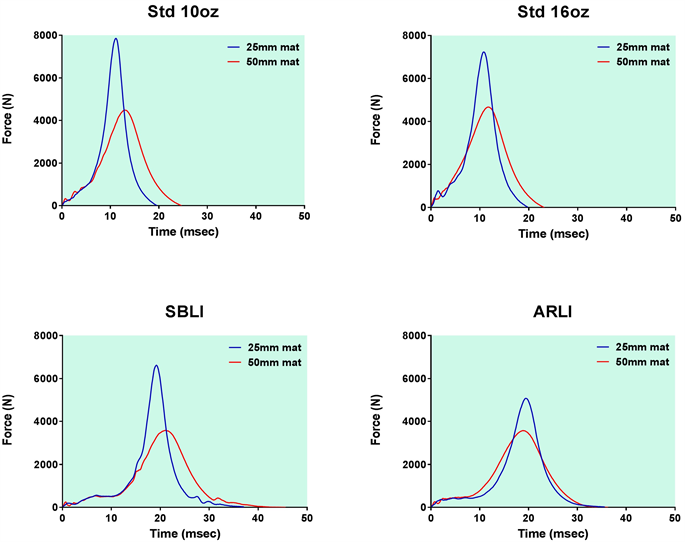 As in our earlier research with a 25 mm thick mat, the area-under-the-curve values with the 50 mm mat were greatest for the Std 16 oz glove and the values for the Std 10 oz and ARLI gloves were very similar to each other. Again, the values for the SBLI glove were less than those for the Std 16 oz glove, but slightly higher than those for the other two glove types. Given that the SBLI glove had the lowest mass, the explanation for the latter finding is unclear, although the