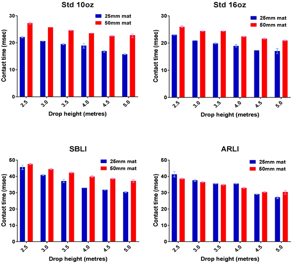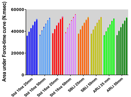 Computation of areas under the force-time curves yielded values very similar to those calculated in our previous study, where the thickness of the mat was only 25 mm (Figure 11). Over 24 combinations of glove type and drop height, there were 17 in which values for the 25 mm and 50 mm mat thicknesses were within 2% of each other, and another five where the difference was less than 2.5%. Given that pre-impact glove velocities determined with the Vicon Motion Capture system were slightly lower with the thicker mat, we expected that the calculated area-under-the-curve might also be lower under this condition, but no such effect was detected.