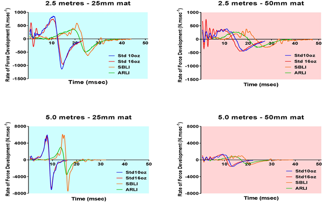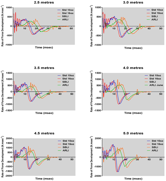 In addition to the above variables, we determined rates of force development. This was accomplished by calculating changes in force over running periods of 0.5 msec and multiplying the results by two to yield measurements in N.msec−1. Consequently, our first data point corresponded to 0.6 msec after glove contact with the force plate and new data points when then generated for every further period of 0.1 msec until glove contact ceased. Curves showing progression in rate of force of development when gloves were dropped on to the force plate covered with the 50 mm mat are presented in Figure 12.