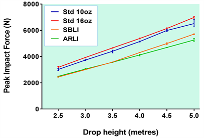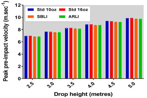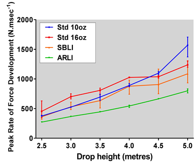 during actual competition [4] , the ARLI glove was able to reduce peak rate of force development by 27% - 49% compared to that measured with the Std 10 oz glove. Furthermore, the reduction became larger as drop height and therefore pre-impact glove velocity increased. The ARLI glove also produced peak rates of force development that were 25% - 37% below those observed with the SBLI glove, despite these two gloves generating quite similar peak force readings across the range of drop heights.