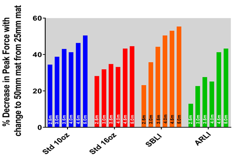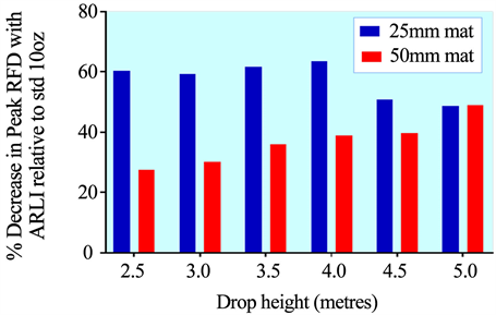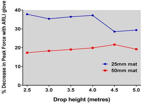 Figure 15 shows how mat thickness influenced the percentage by which the ARLI glove reduced the peak rate of force development relative to that seen with the Std 10 oz glove. The effect of mat thickness lessened as the height from which gloves were dropped increased, and at a drop height of 5.0 metres the reduction in peak rate of force development provided by the ARLI glove was ~49% with both the 25 mm and 50 mm mats.