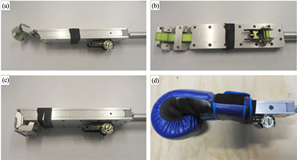 Figure 1. The mechanical fist used in the experiment. Panel (a) shows the three hinged metal sections of the fist; Panel (b) shows the mechanism used to draw the fist closed; Panel (c) shows the fist in the locked position; Panel (d) shows a glove fitted to the fist and highlights the accuracy with which normal glove positioning on a fist was simulated.