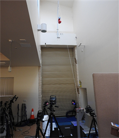 A Vicon Motion Capture System (Oxford Metrics Ltd., Oxford, UK) with four cameras each sampling at 500 frames per second was used to determine glove velocities just before and after impact with the force plate. Markers placed on gloves allowed determination of displacement and thus calculation of velocity over successive 2-msec time periods. To facilitate data synchronization, the Vicon software was used to capture data from the cameras and the force plate. Glove contact with the force plate was defined as the period between occurrence of a force continuously above 20 N in the ascending phase of the force-time curve and return of the force to readings below 20 N in the descending phase. Employment of the 20 N threshold ensured that identification of contact would not be contaminated by previously quantified levels of baseline noise in force plate electrical activity. The drop testing system used in the experiment is shown in Figure 2.