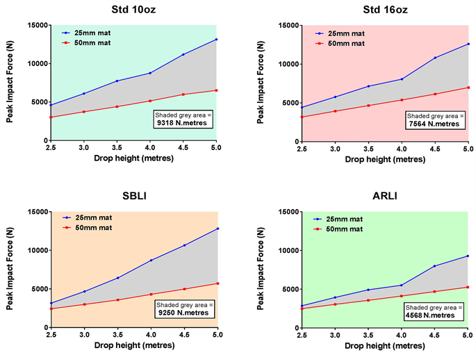 The peak impact forces recorded with the 50 mm mat covering the force plate are shown Figure 3.