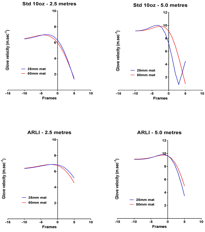 The velocity data revealed that at drop heights of 2.5 to 3.5 metres, slowing during the first few video frames after contact was essentially unchanged by extra force plate padding for any of the gloves. At a drop height of 4.0 metres, higher velocities during the immediate post-contact period became evident for the Std 16 oz glove and this was observed also at 4.5 and 5.0 metres. For the Std 10 oz and SBLI gloves, higher velocities were seen only at 4.5 and 5.0 metres. In the case of the ARLI glove, there was no change up to and including 4.5 metres, and only a very slightly higher post-contact velocity even at 5.0 metres. For illustrative purposes, data for the Std 10 oz and ARLI gloves at drop heights of 2.5 and 5.0 metres (the extremes of the range of drop heights employed) are presented in Figure 8. We interpreted the data as indicating that the initial dynamics of the interaction between glove and force plate padding were determined by the properties of the padding material rather than its thickness, and that the added thickness became important in reducing glove deceleration only once the ability of the structural characteristics of the gloves to exert that effect began to approach a maximum.