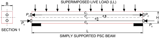 Consider an simply supported isometric beam of length L width B and depth H which has been reinforced with post tensioned tendons and post compressed high strength steel bars at eccentricities et and ec at bottom and top from the neutral axis respectively as shown in Figure 6. The beam is subjected to various internal and external loads such as the self-weight of the beam (gk), superimposed dead load (DL), superimposed live load (LL). The cross sectional area of the beam is denoted by Ac and the sectional modulus at top and bottom of the surface is denoted as ZTOP and ZBOT respectively. The notation Cg refers to centroid of the concrete section and CT and CB denotes the centriods of reinforcement at post compression and post tensioned regions respectively.