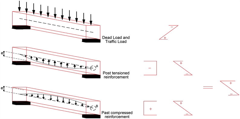 Figure 1. Showing the mode of action of pre stressed structure when subjected to dead load, traffic load, post tensioning and post compression (courtesy: IABSE Structures C-12/80 IABSE PERIODICA 1/1980).