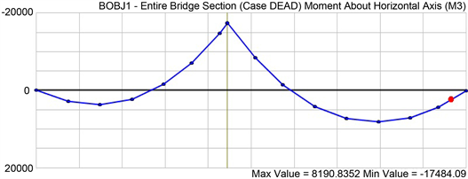 The Design of the PSC Bridge was done through CSI Bridge 2017 versioned software. In order to account for variability, the shape of the bridge was considered to be parabolic in nature with sloping at mid section from both left and right ends [5] [6] . The PSC Bridge consisted of two abutments at the ends for support and 3 columns with bent cap at center of the span for bearing purposes (Figure 7(a) and Figure 7(b) and Figure 8). The designed bridge was checked on safety for earthquake and wind load vibrations and respective design response spectrum was also noted down. The Horizontal Ultimate moments and the Vertical Shear forces were also noted down (Figures 9-11).