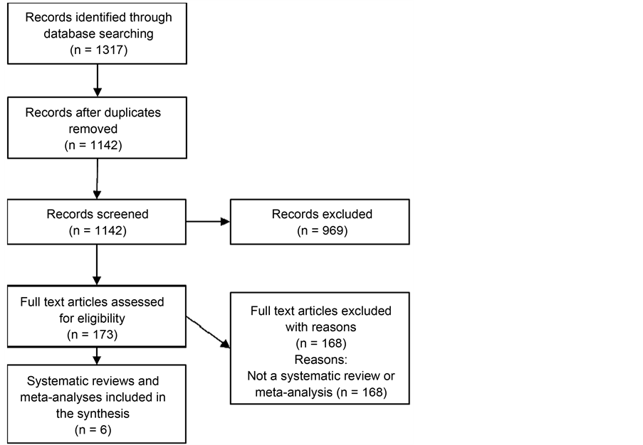 The search identified 1317 articles, and after removing 175 duplicates, we screened 1142 articles. Of these, six fulfilled the inclusion criteria and were included in this review of reviews (see Figure 1 and Table 1).