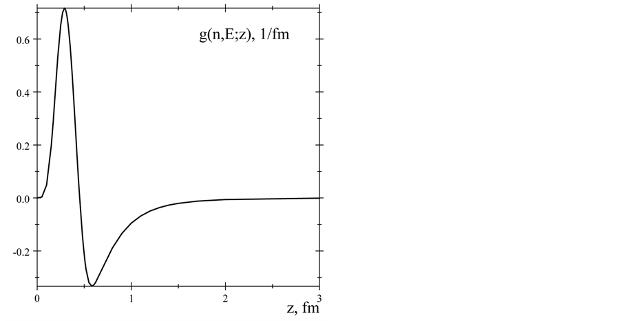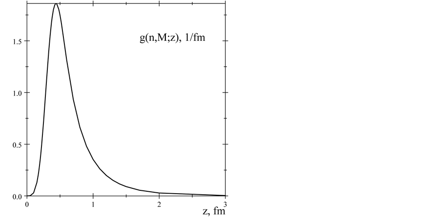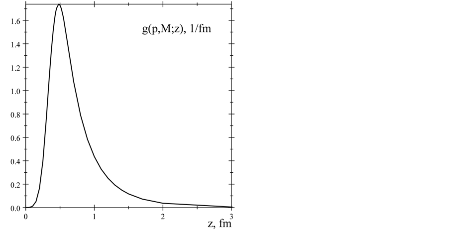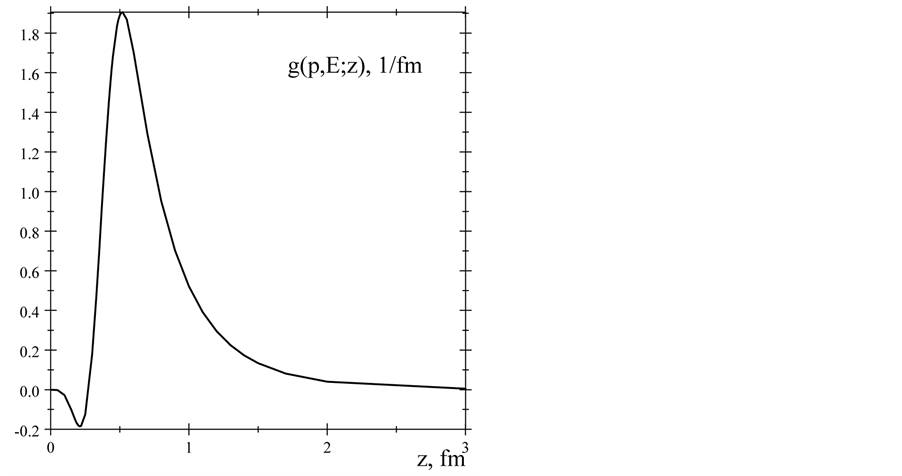 Figure 5. The proton’s charge density distribution w(p, E; z) (solid line) and density distribution corresponding the dipole form factor, Equation (21) (dashed line).
