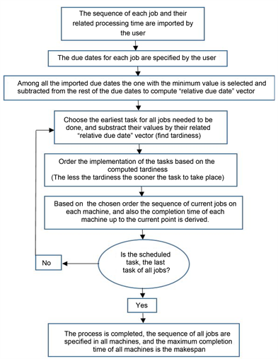 The proposed algorithm has been developed based on some primary dispatching rules including “earliest due date” of each job, “shortest processing time” of each operation, “least tardiness” of operations in each sequence and “first come first serve” idea. The theory behind using these simple rules is to create a heuristic method with a straightforward procedure to apply to JSP problems, concluding to acceptable results. The efficiency of the results comparing to other heuristic algorithms, is also contemplated. Besides, the proposed method is designed in such a way that the due dates’ values required to be specified by the user. This advantage can equip users to affect their tendency in using specific due dates in the scheduling problems.