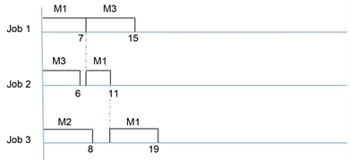 Table 1 shows a JSP example, consisting of 3 jobs and 3 machines. The processing times and due dates are also specified. Each job is defined in each row of the table. Each job consists of some operations, required to be done by a particular machine, which each of the operations has a deterministic processing time specified in the table. For instance, Job 1 has three operations; first operation processing time is 7 minutes (instead of minutes any unit of time can be used), and it needs to be done by machine 1 (M1).