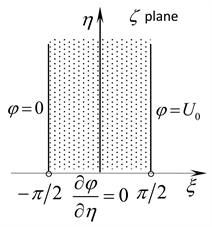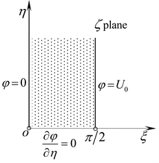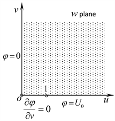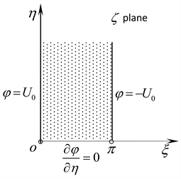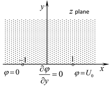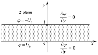 Thus, the infinite long strip domain on the z plane is mapped to a semi-infinite long strip domain on the plane, and the boundary condition at the bottom of the semi-infinite strip domain mapped are second kind of boundary
