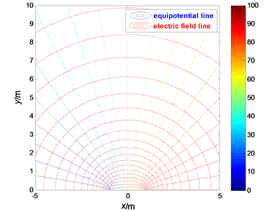 In order to give an intuitive image of the distribution of the electric field in the semi-infinite domain above the charged plane, and to verify the correctness of the conclusion of the results of the above research, next, the electric field line and the equipotential line diagram of the electric field in the semi infinite region above the charged plane are plotted by the mathematical software MATLAB, as shown in Figure 3. It can be seen that the electric field lines are perpendicular to the surface of the conductor and the equipotential lines and neither electric field lines emit from the boundary of the second kind of boundary condition (i.e.