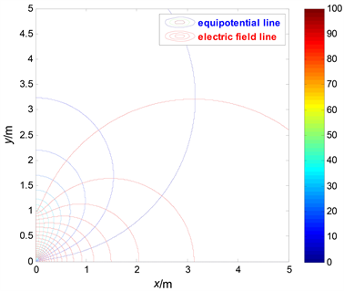 In order to give an intuitive image of the electric field distribution in the charged right angle domain, and to verify the correctness of the conclusion of the above research, the electric field line and the equipotential line diagram of the electric field in the infinite long charged right angle domain are plotted by the mathematical software MATLAB, as shown in Figure 7. It can be seen that the electric field line is perpendicular to the surface of the conductor and the equipotential lines and neither electric field lines emit from the boundary of the