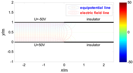In order to give an intuitive image of the electric field distribution in the finite long charged strip domain, and to verify the correctness of the conclusion of the above research, the electric field line and the equipotential line diagram of the electric field in the infinite long charged strip domain are plotted by the mathematical software MATLAB, as shown in Figure 10. It can be seen that the electric field lines are perpendicular to the surface of the conductor and the equipotential lines and neither electric field lines emit from the boundary of the second