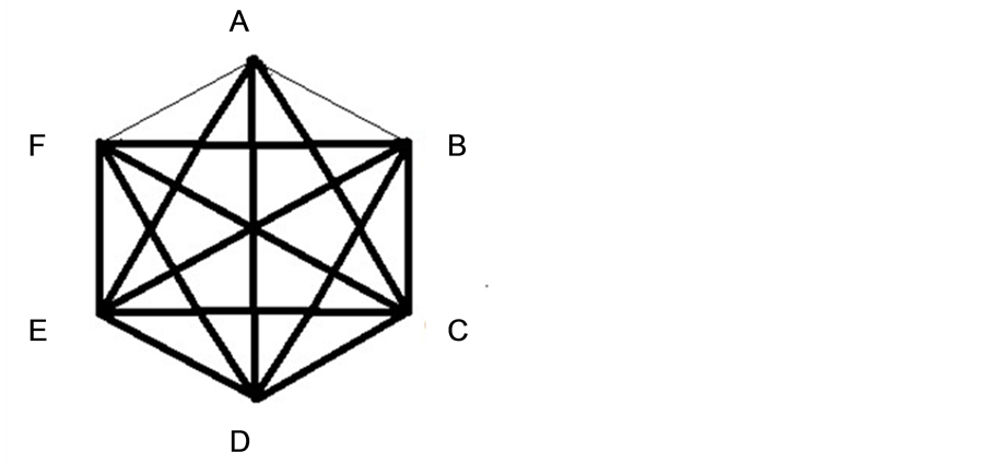 Let’s lead to Ramsey problem by a classic life example: six people together, there are at least three people either knowing each other or unknowing each other. If using graph theory to prove this problem, then we can represent these six individuals with six vertices A, B, C, D, E, F. Over these six vertices for the complete graph, if two people know each other connect the two vertices with a solid line, else with a dotted line.