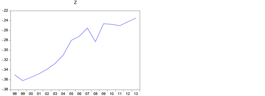 Table 3 shows that there was a gap between the actual housing trade volume and effective demand volume and effective supply volume in Chinese housing market during 1998 and 2013, which indicates that Chinese housing market had been in a state of disequilibrium. We define the degree of disequilibrium Z = (lnD − lnS)/ lnQ, which is used to measure the strength and direction of disequilibrium in the housing market. The greater is the absolute value of Z, the stronger is the unbalanced degree of the market. If Z is positive, the market demand is greater than supply, namely supply in the short side. If Z is negative, the market supply is greater than the demand, namely demand in the short side [13] . In order to analysis the change of the efficiency of housing market in China, we draw the time sequence diagram of the unbalanced degree of Z and market efficiency E, see Diagram 1 and Diagram 2.