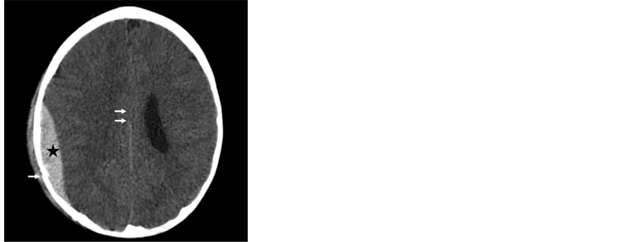 Figure 1. Cerebral scan without iodinated contrast injection: Axial-parenchymal window cut showing a spontaneous hyper density right temporal extra axial, bi-convex lens corresponding to an extra-dural hematoma right temporal (a star) in front of a fracture line (put a bone window and show) (b, arrow), and a mass effect on the right lateral ventricle (a, double arrows).