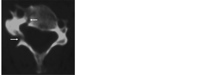 Figure 2. Cervical Scan without iodinated contrast injection: Axial bone window cut showing a right corporeo-laminar fracture of C3, unstable look (arrows).