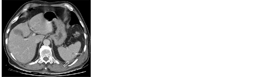 Figure 3. Abdominal scan with injection of iodinated contrast agent (portal phase): axial parenchymal window cut showing a small home of splenic contusion (full arrow), with discrete subcapsular hematoma (open arrow) from the vascular pedicle distance.