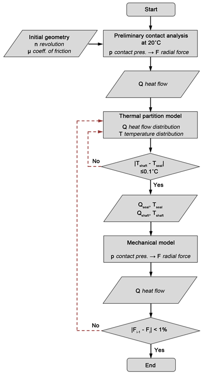 The obtained temperature data was then mapped onto the parts of the mechanical model as a temperature load. As the material model of the rubber is temperature dependent, and the thermal expansion of the parts were taken into consideration, the result of the mechanical model is the contact pressure distribution between the seal and the shaft modified by the aforementioned factors. This contact pressure distribution was again used to calculate the total heat flow, and this modified heat flow was divided by the thermal partition analysis, where the procedure started over. The iteration of the results ended when the change of the total radial force became less than 0.5%. The flow chart of the procedure can be seen in Figure 3.