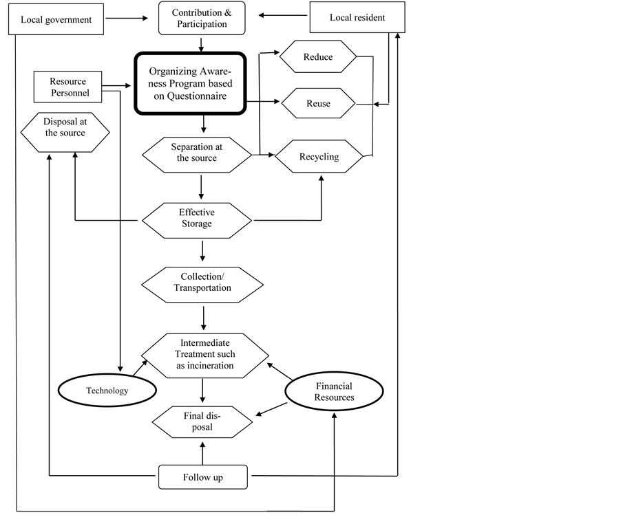 Solid-waste management, especially in developing countries, poses particular problems for each local community, so empirical field investigations are invariably required to solve particular local issues. Solid-waste ma- nagement is emerging as a major problem for policy makers in developing countries as the quantity of solid waste generated has increased significantly and its characteristics have changed as a result of changes in peoples’ lifestyles due to swift industrialization and urbanization. Rapid population growth and an increase in economic activities combined with a lack of education in modern solid-waste management practices, complicate efforts to improve the situation in these countries. Compared to high-income residents in developed countries, the urban residents of developing countries produce less solid waste per-capita. However, the capacity of developing countries to collect, process, dispose, or reuse the waste in a sustainable manner is highly limited. Recent studies have demonstrated the lack of capacity of local authorities to deal with this emerging issue and have recommended improvements at all levels of the administration systems to achieve a sustainable solution to the problem [4] [20] [21] .