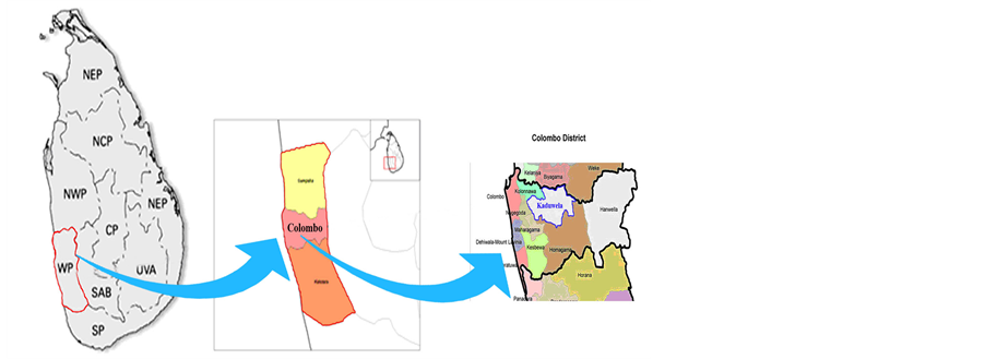 The Democratic Socialist Republic of Sri Lanka is located off the southeastern coast of India and covers an area of 65,610 km2 between 5˚55'N and 9˚55'N and 79˚41'E and 81˚54'E. The Palk Strait separates Sri Lanka from India. Figure 1 shows a map of Sri Lanka with its nine provinces, three districts of western province (WP) and nine local authorities in Colombo District. Sri Lanka’s population was approximately 20 million in 2012 with a per capita gross national product (GNP) of US$1395 and a growth rate of 7.7% [23] .