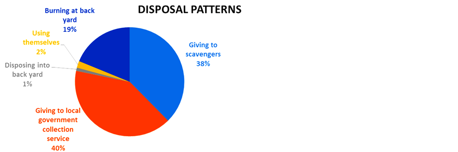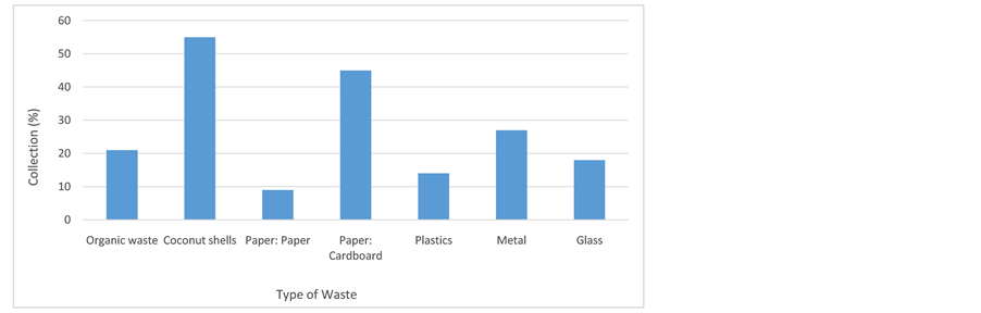 Figure 4 shows the percentage of the community utilizing each disposal pattern of recyclable waste. Accordingly 38% practiced recycling mainly metal and glass by giving to scavengers, while 40% used the government waste-collection system. These results indicate that the public are not concerned with recycling at source, preferring instead to opt for the costly government collection and transporting system. Furthermore, 19% of the community practice back-yard burning, which can be hazardous to human health because of harmful gas emissions, such as dioxins and furans, resulting from incomplete burning. This also shows that the general public is unaware of the dangers of such improper disposal methods. Figure 5 shows the percentage distribution of recyclable material collection. It indicates that people mainly recycle cardboard and coconut shells. They have not paid any attention to the recycling of other materials, indicating they are less enthusiastic about recycling. The questionnaire also revealed that the public consider the responsibility of waste disposal should be taken by the Pradeshiya Sabha and had a low awareness of solid-waste management, including waste reduction, reuse, and recycling. The survey also revealed that 40% of families in the community gave their organic waste to the government collection service, while 50% selected composting (data not shown). Of these, 97% preferred home composting using compost bins. They used low cost compost bins in preference to bulky bins.