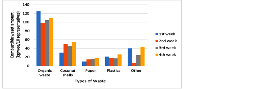 It is difficult to find a large enough land area in the Battaramulla region as the cost of real estate has increased. Considering the fact an incinerator is proposed as a suitable technique for the ultimate treatment method, it was also observed that 15% of the waste stream that cannot be reused or recycled contains materials suitable for combustion. Figure 6 shows the amount of combustible waste from 10 representatives from 150 families. Except for “Others” such as clothes/textile, rubber, leather, and so on, all types of waste were constantly generated in almost the same amounts from the first to the fourth weeks. As the total quantity of waste diverted for incineration is about two metric tons per day, an incinerator of less than one metric ton capacity was selected through literature review. The average moisture content of the waste available for incineration was 28%. Since waste for incineration should have a moisture content less than 30% the sample satisfied the scientific conditions. It was noted that the exhaust emission of incinerating certain waste, such as batteries, is harmful to the environment so it is recommended that further sorting of particularly hazardous waste be undertaken. Due to economic consid- erations, the feeding method may be manual using backhoes. There should be two or three laborers for the incinerator who can feed the waste manually with a capacity equal to the waste feeding rate. Although the installation cost of an incinerator is high, its operation could reduce environmental health problems expected from the improper management of putrescible solid waste, such as health disorders, sickness, and communicable diseases. The back-yard burning of waste causing air pollution could be banned as the combustible waste can now be sent to the incineration plant.