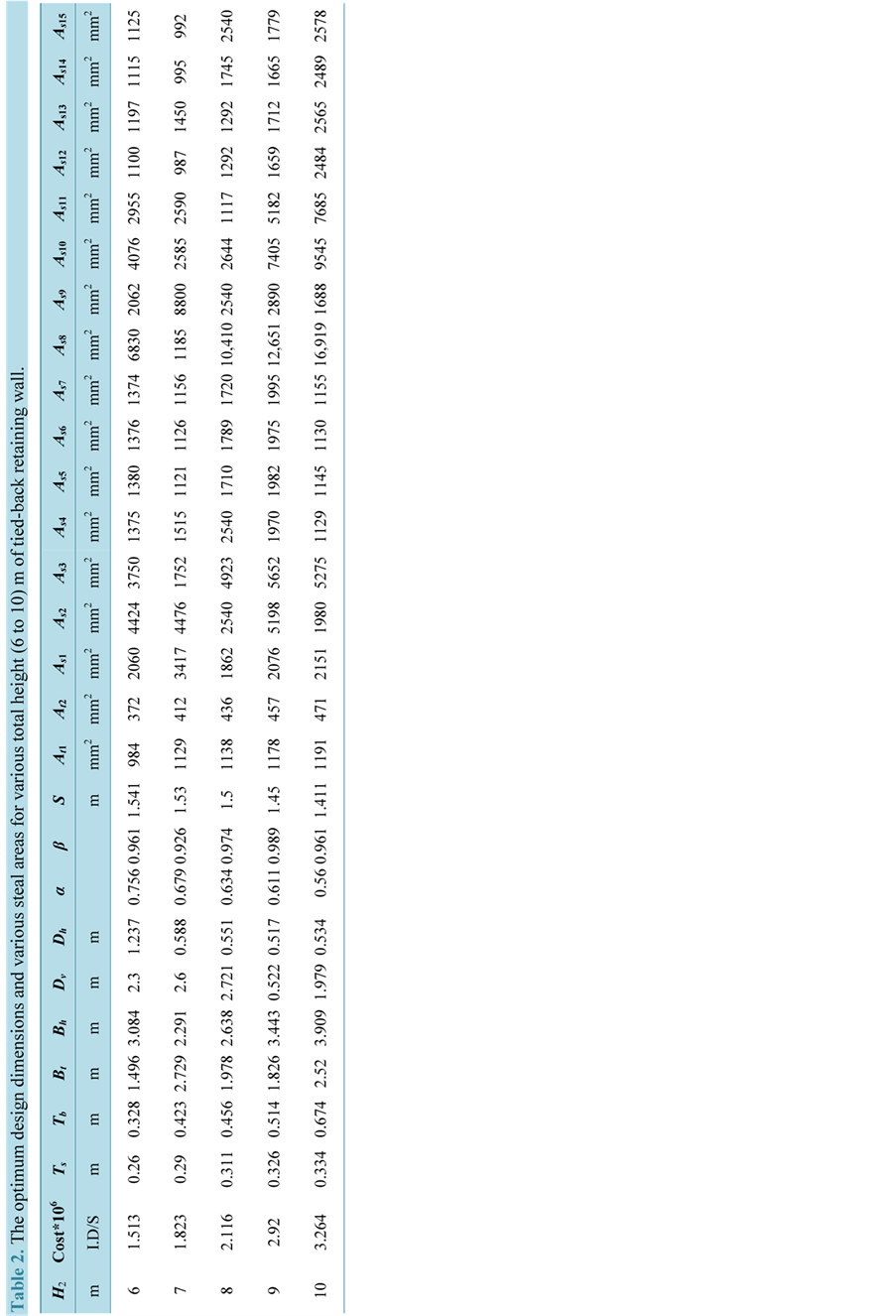 The optimal solution has been summarized in Table 2 and Figure 3 in which the height represents the total height of tied back retaining wall H2.