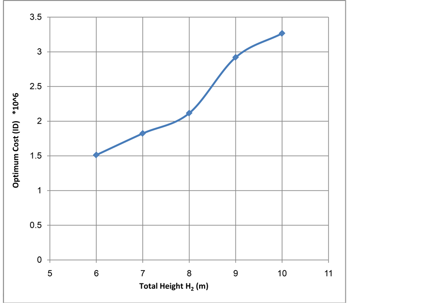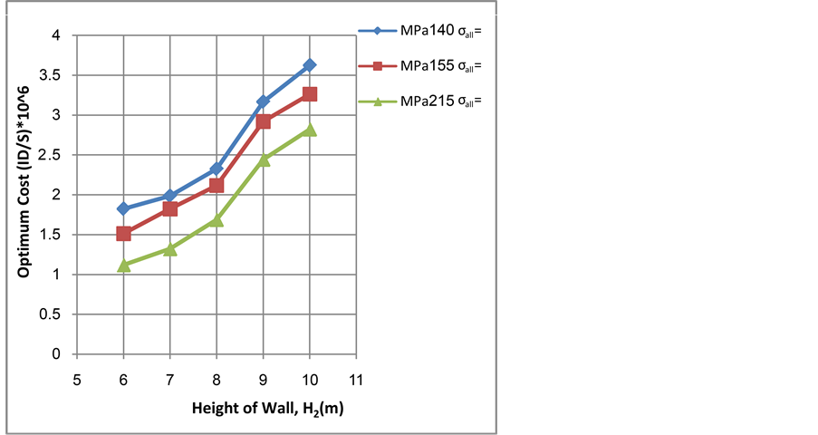 Figure 13. Optimum cost versus total height, H2, for different allowable stress values, σall.