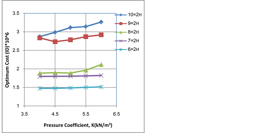 Figure 4. Optimum cost versus pressure coefficient, K, for different values of wall height, H2.