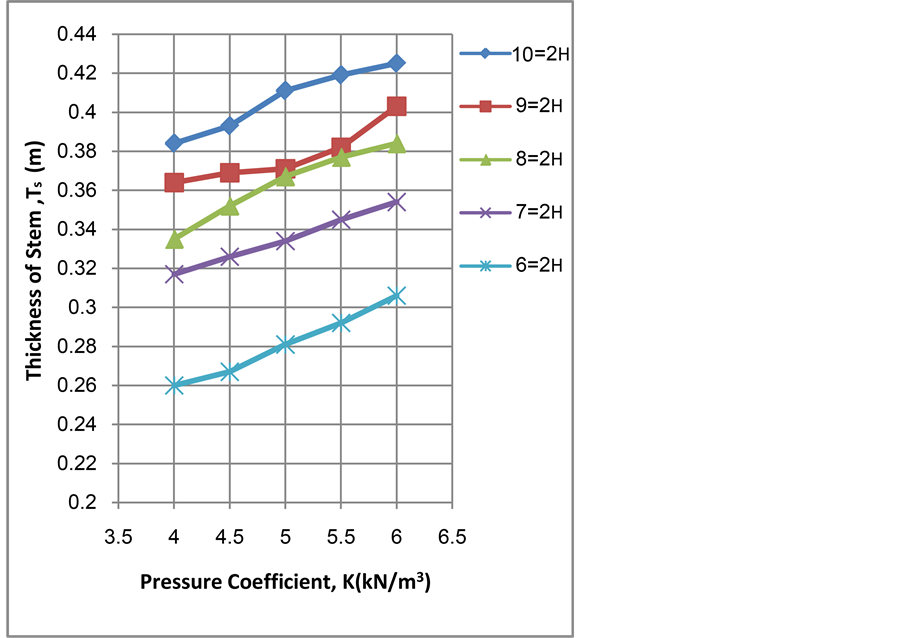 Figure 6. Stem thickness, Ts, versus pressure coefficient, K, for different values of wall height, H2.