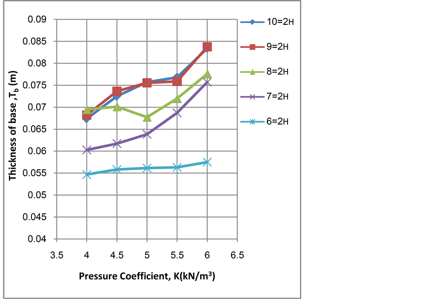 Figure 7. Base thickness, Tb, versus pressure coefficient, K, for different values of wall height, H2.