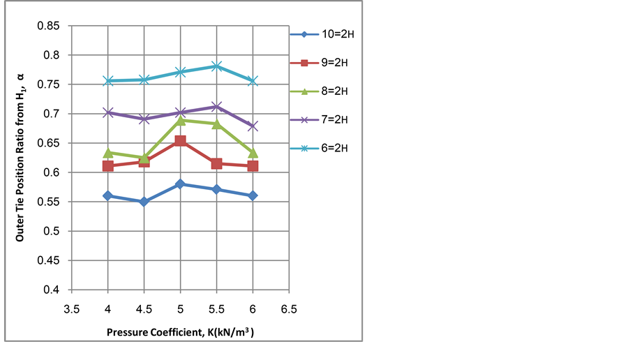 Figure 9. Outer tie position ratio from H1, α, versus pressure coefficient, K, for different values of wall height, H2.