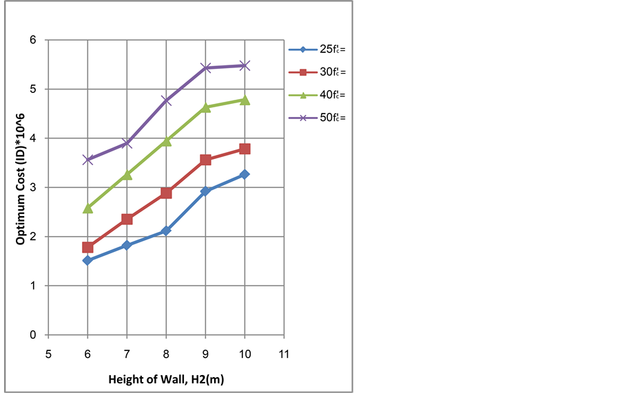 Figure 11. Optimum cost versus total height, H2, for different compressive strength values,