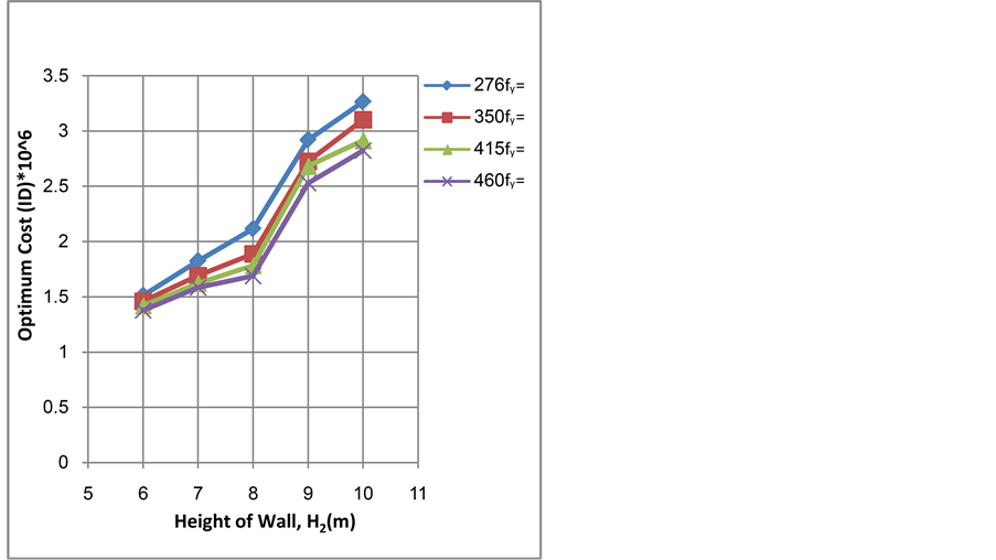 Figure 12. Optimum cost versus total height, H2, for different yield strength values, fy.