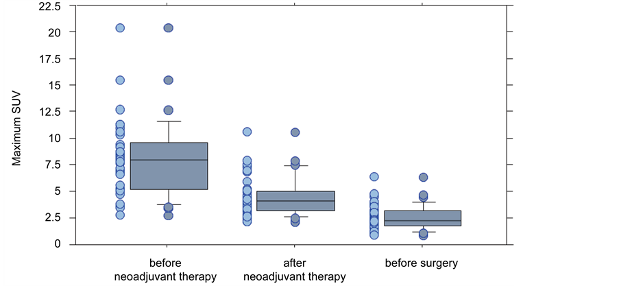 Figure 1. Mean maximum SUV was measured at three points. Analysis revealed that the mean maximum SUV before neoadjuvant therapy was 8.09. The maximum SUV at the end of neoadjuvant therapy was 4.48, and 2.58 before surgery.