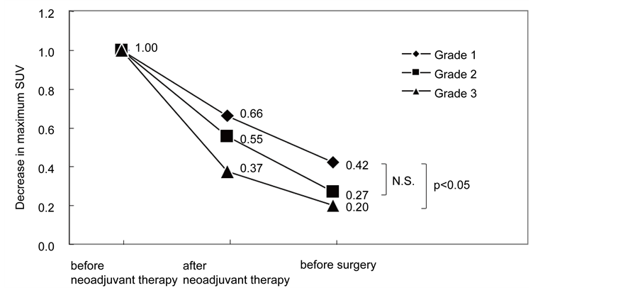 Figure 2. Relationship between the observed histopathological response and mean decreased rate of SUV. Mean rates of the maximum SUV at the end of neoadjuvant therapy were related to the values before neoadjuvant therapy as outlined below: Grade 1, 66%; Grade 2, 55%; Grade 3, 37%. Similarly, mean rates of the maximum SUV at the end of neoadjuvant therapy relative those values before surgery were as follows: Grade 1, 46%; Grade 2, 30%; Grade 3, 20%.