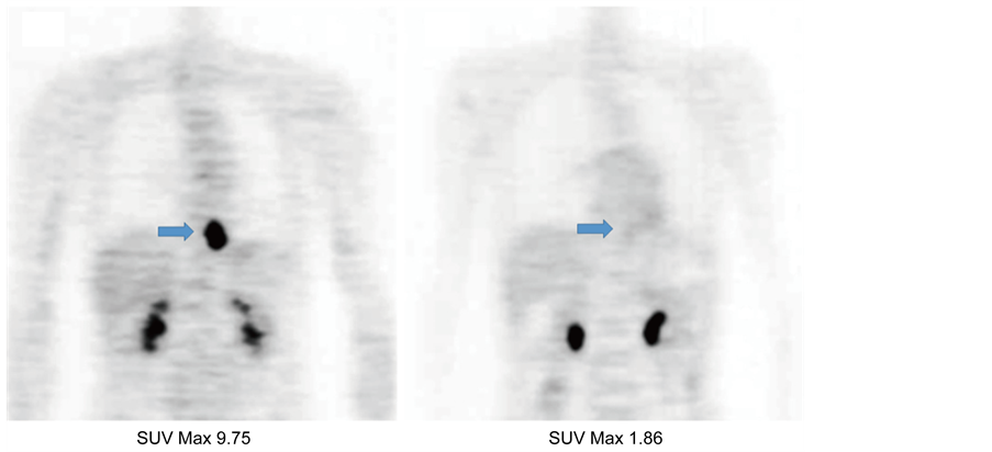 Figure 3.PET scan of a patient rated as having a pathological CR (Grade 3). The patient was 68 years old, male. He had a type 3 tumor in lower thoracic esophagus which was suspected to have invaded to the descending aorta. The patient underwent neoadjuvant hyperthermo-CRT using docetaxel. (a) The lesion demonstrated significant FDG uptake (arrow; the maximum SUV 9.75) and was detected prior to neoadjuvant therapy; (b) Three weeks following CRT, the FDG uptake was significantly less (arrow; the maximum SUV 1.86). The patient underwent esophagectomy a week after the second PET scan. Pathological examination of the removed specimen revealed no viable tumor cells.